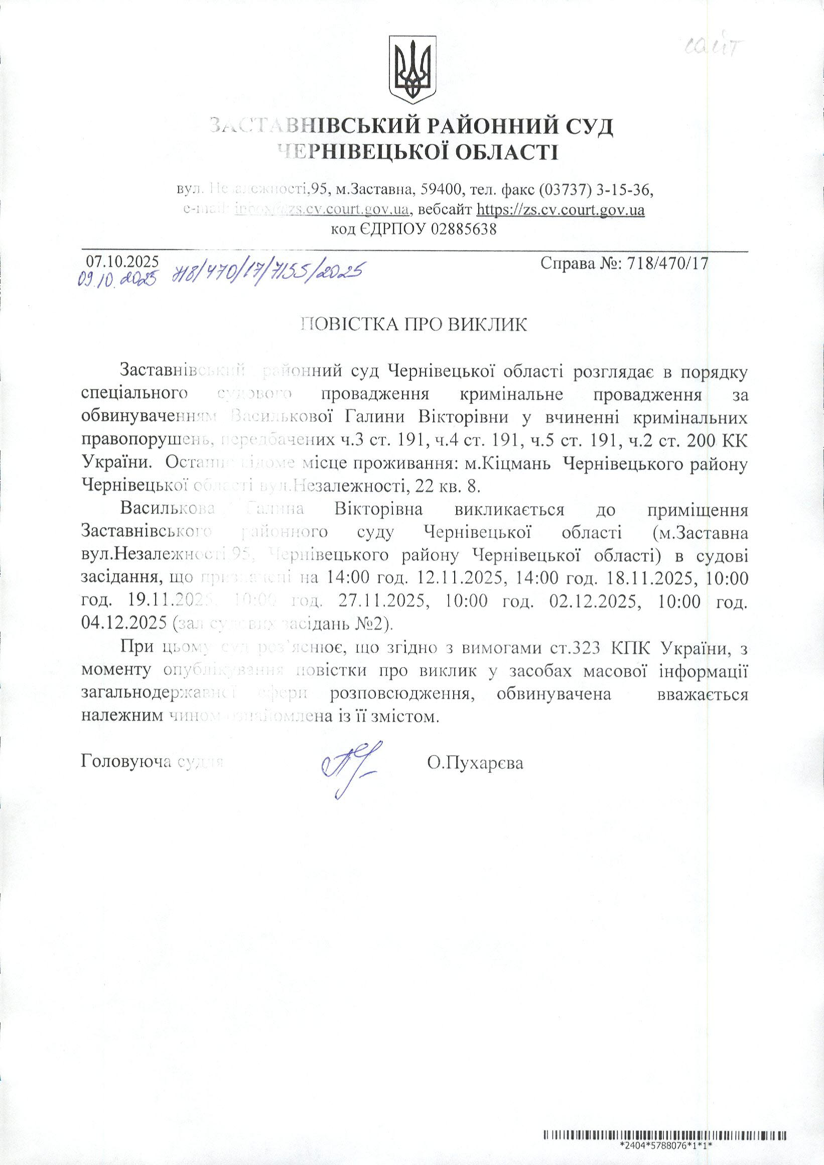 Оголошення про виклик Василькової Галини Вікторівни
